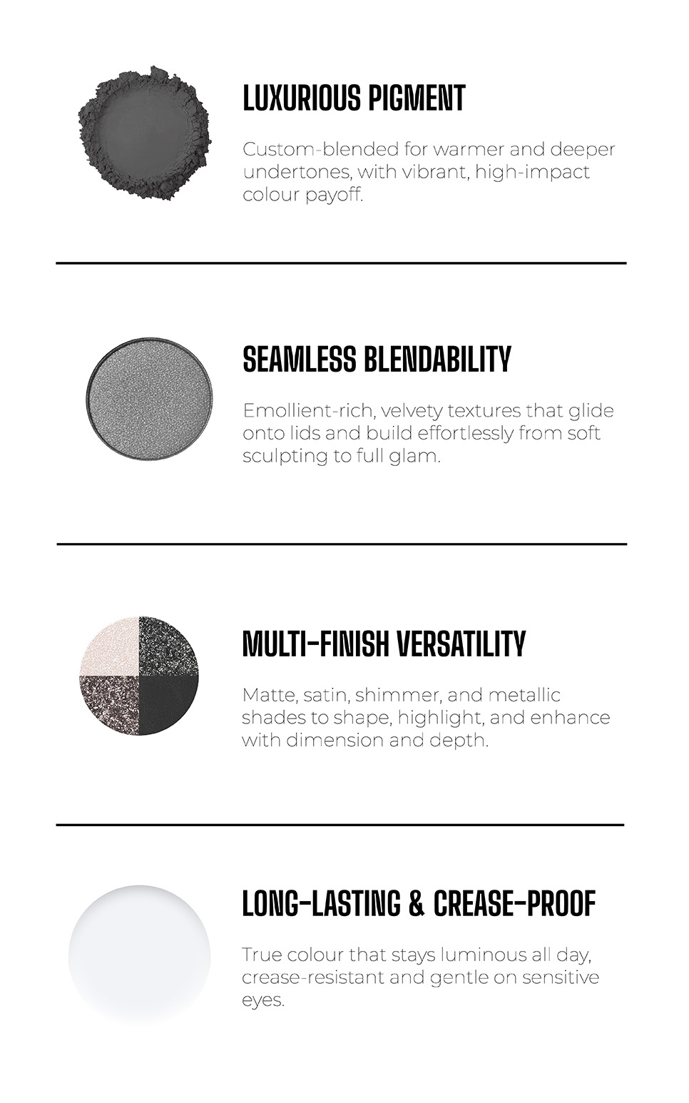 Emollient-rich, velvety textures that glide onto lids and build effortlessly from soft sculpting to full glam.